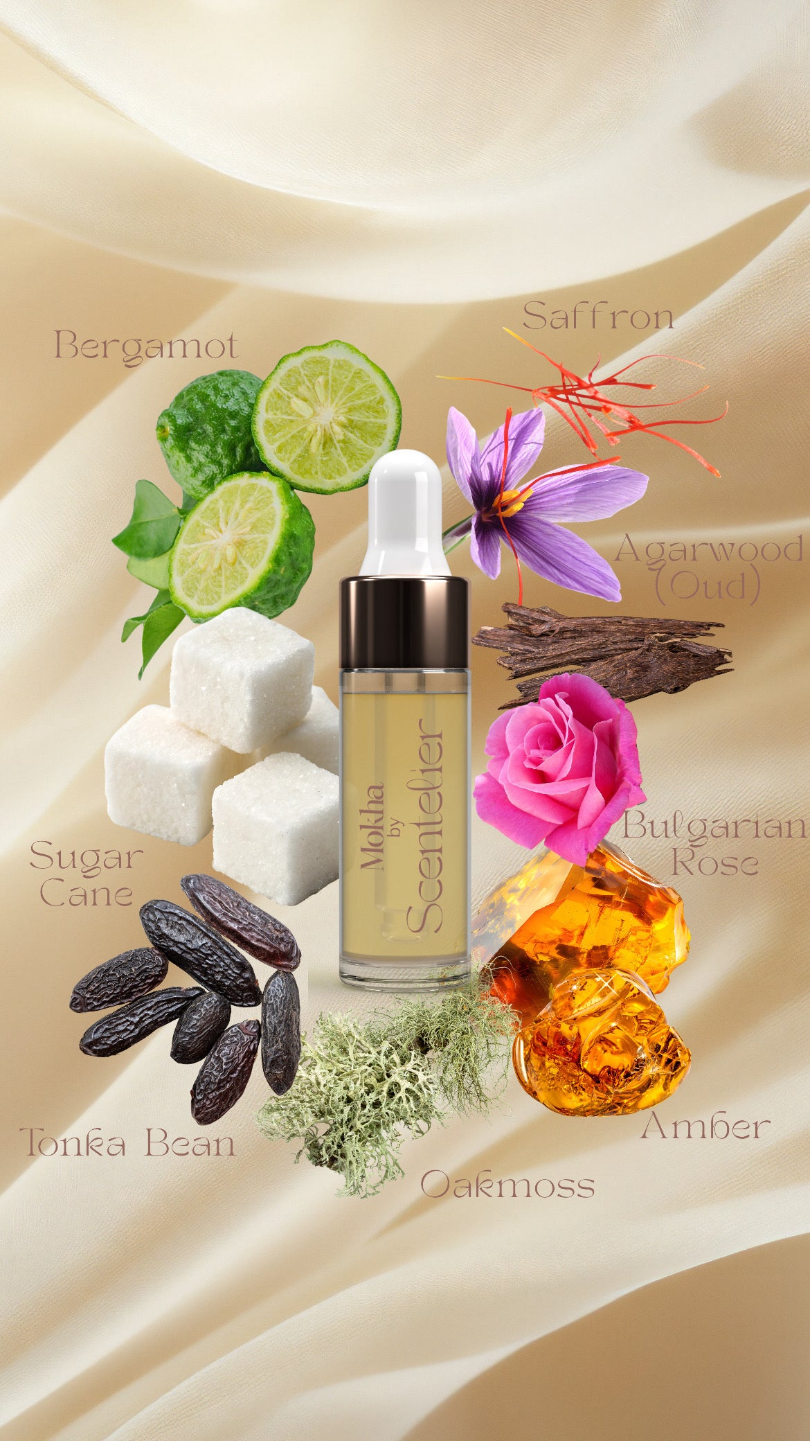 Mokha is a bold, seductive fragrance. It opens with spicy saffron and fresh bergamot, immediately drawing you into its exotic warmth. The heart blends rich oud with rose creating a smoky, addictive richness. As it settles, sugar, tonka bean, amber and white musk fuse together in a powerful, lingering trail that embodies strength and sensuality.